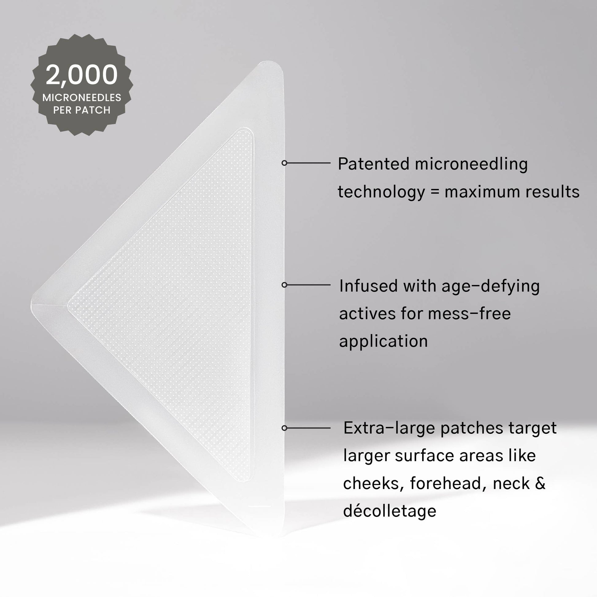 These extra-large versions of our bestselling patches use patented, multi-tasking microneedle technology to target larger surface areas like cheeks and forehead to minimize the look of fine lines/wrinkles overnight.
