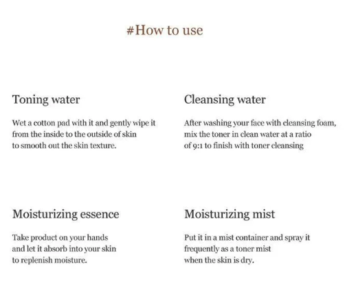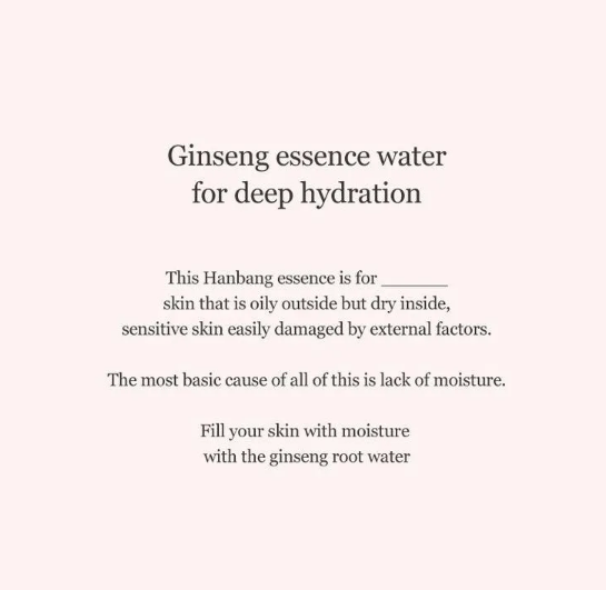 Ginseng essence water contains 80% of ginseng water and focuses on the benefits of ginseng itself, giving sufficient moisture and nutrition to the skin. It fills moisture and nutrition firmly to help keep your skin moisturized for a long period of time.