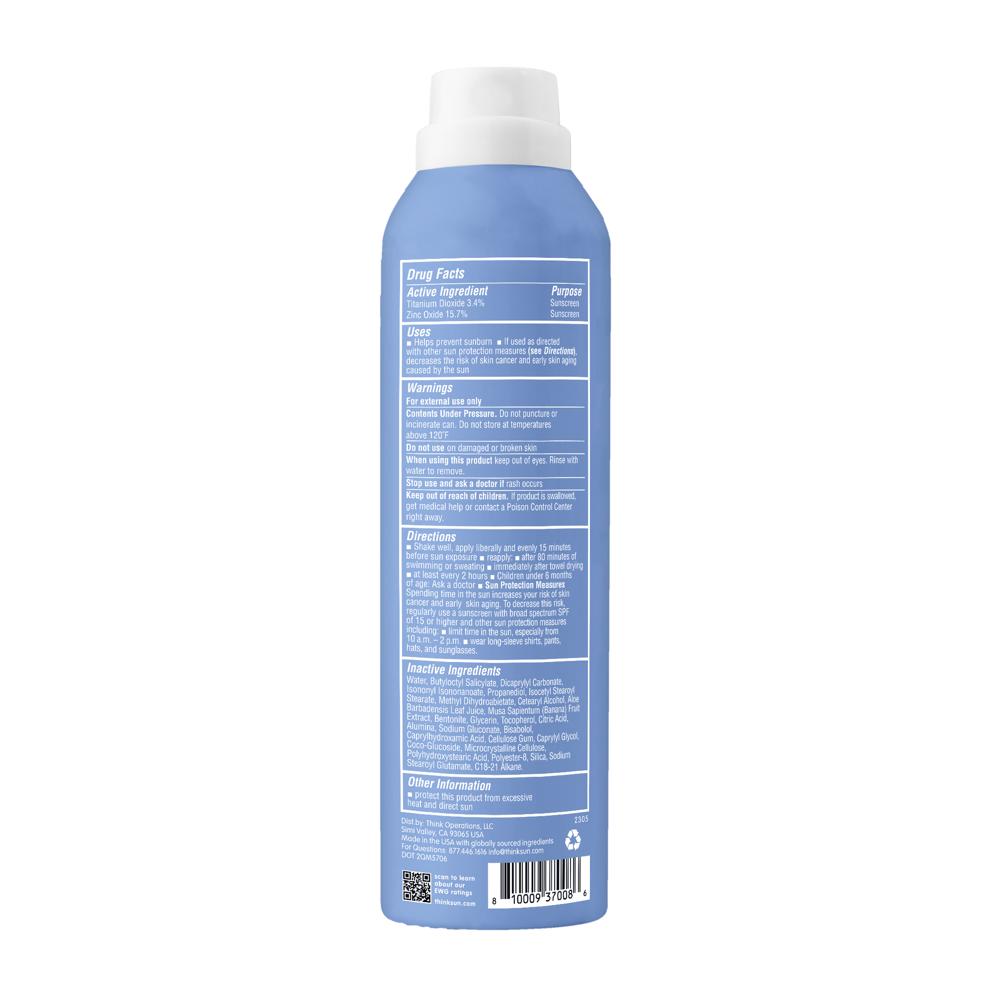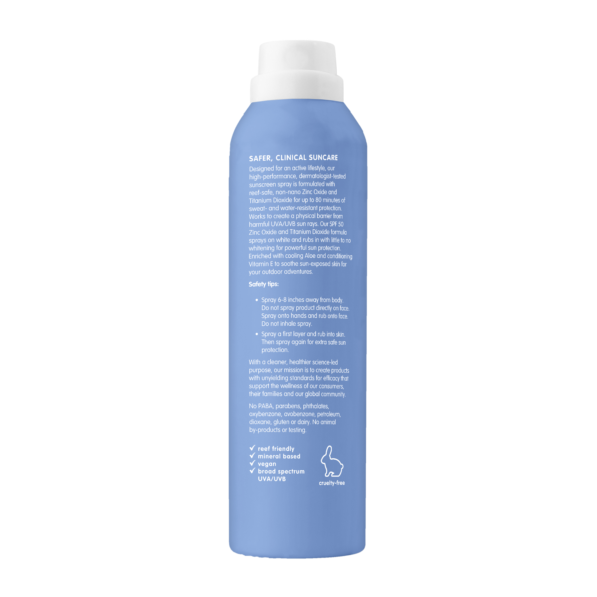 Designed for an active lifestyle, our high performance, dermatologist tested sunscreen spray is formulated with reef safe, non-nano Zinc Oxide and Titanium Dioxide for up to 80 minutes of sweat and water-resistant protection. Works to create a physical barrier from harmful UVA/UVB sun rays.